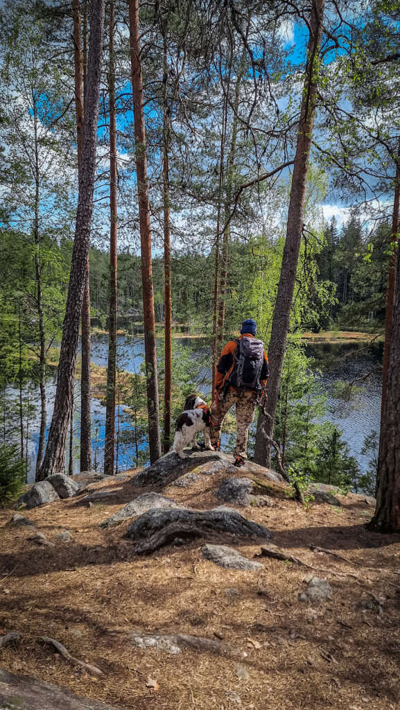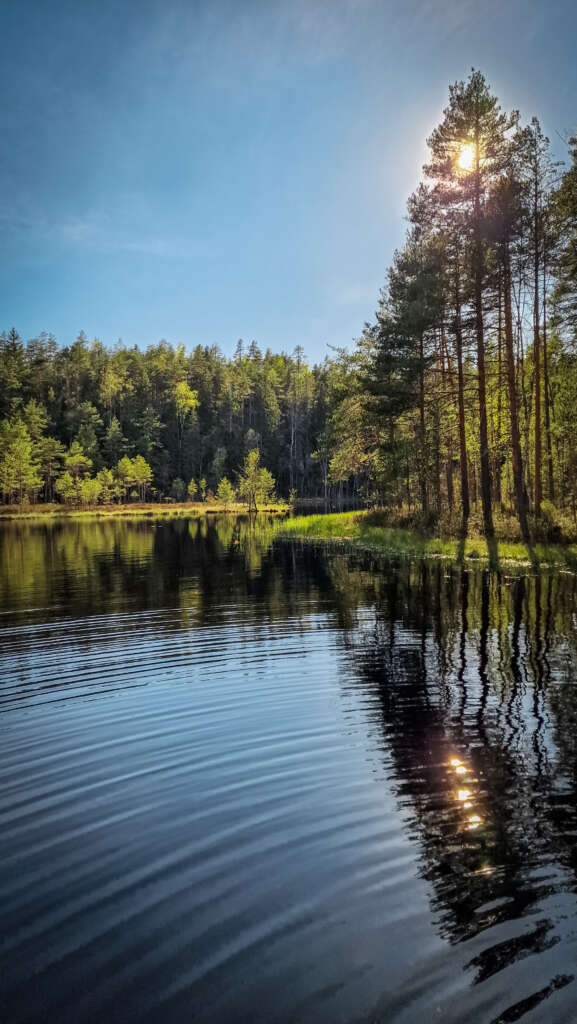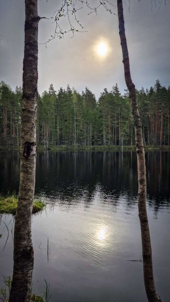 Początkowo szeroka ścieżka pnie się w górę do ciekawego punktu widokowego na jezioro Mustalampi. Jest tu wiatka, a jak dobrze poszukacie, znajdziecie też pole namiotowe i toaletę. Schodzimy do jeziora i skręcamy w prawo. Znowu musimy pokonać wzniesienie. Trzeba się do tego przyzwyczaić, bo nie licząc terenów bagiennych, Finlandia jest mocno pagórkowata i skalista.