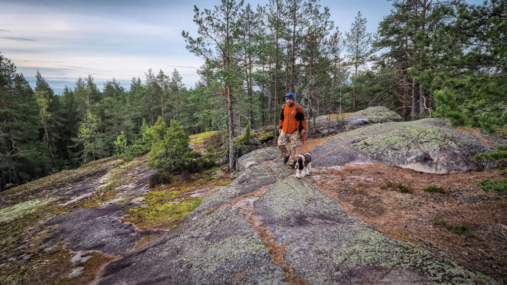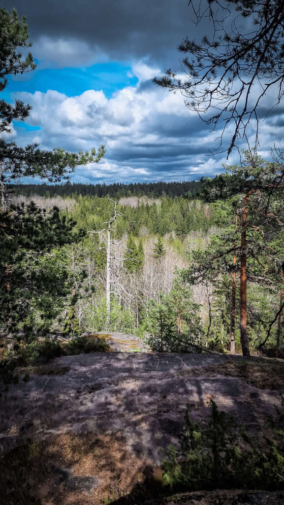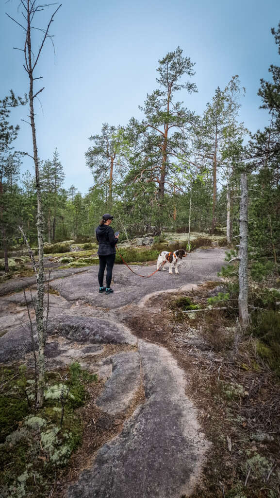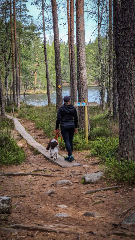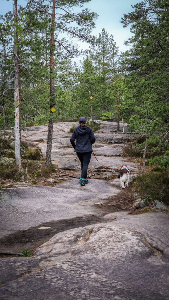 Szlak oznaczony jest tym razem kolorem żółtym. Początek oba szlaki mają wspólny aż do zejścia nad Mustalampi. Tutaj przechodzimy przez mostek i kierujemy się dalej prosto. Oczywiście nie brakuje przewyższeń i genialnych płaskich skał. Wspinamy się na 110m.n.p.m. i wędrujemy masywem skalnym. Niewiele tu drzew, więc klimat miejsca jest obłędny.