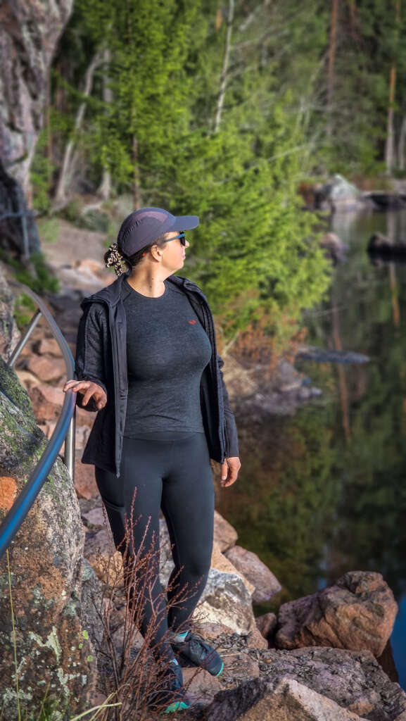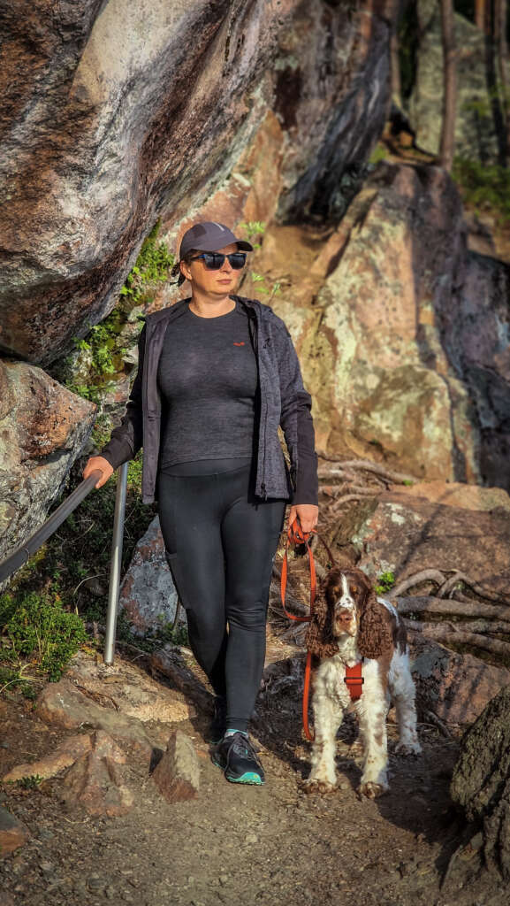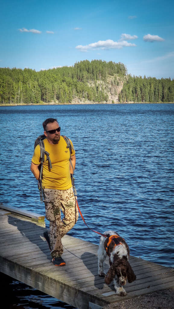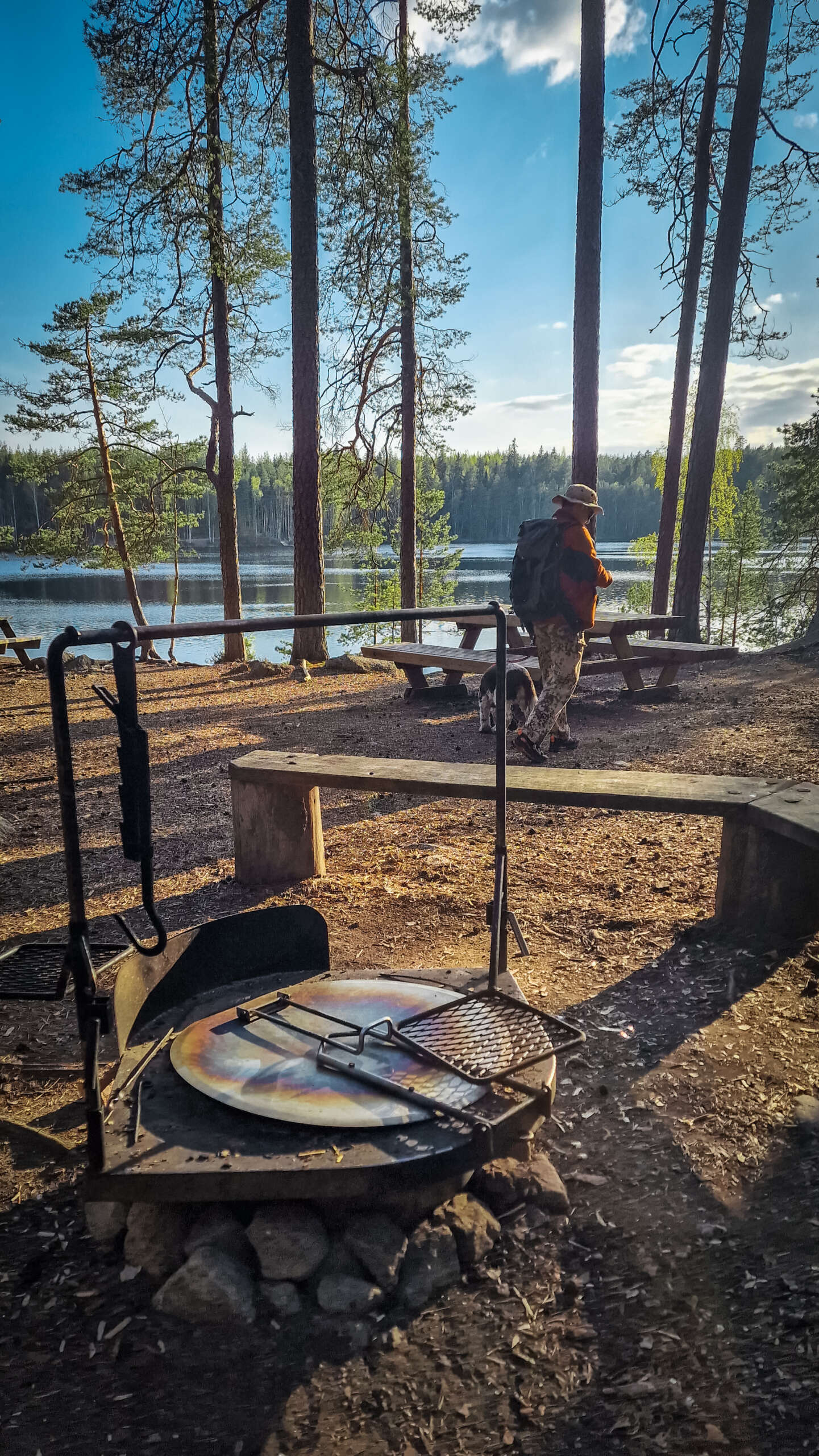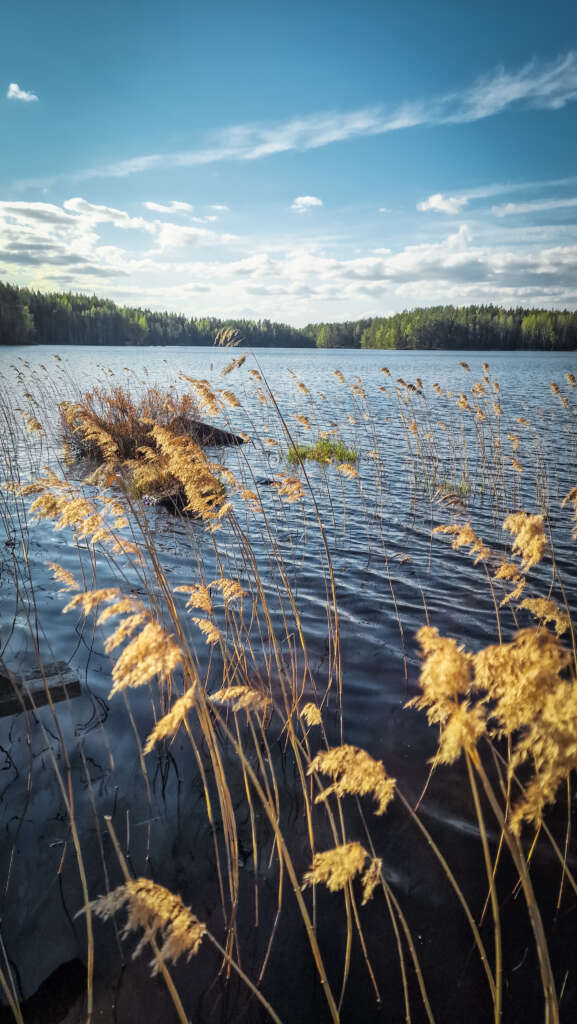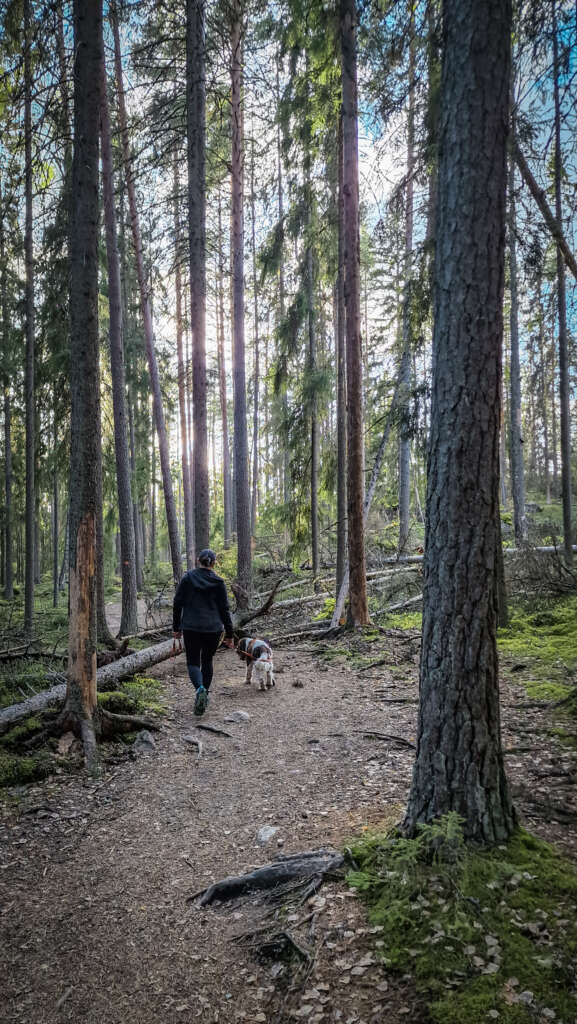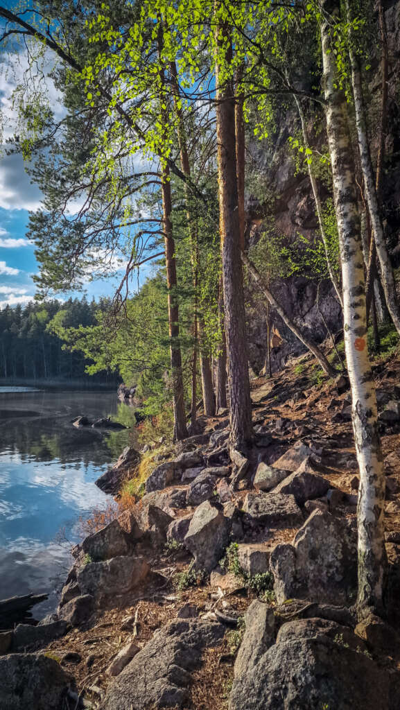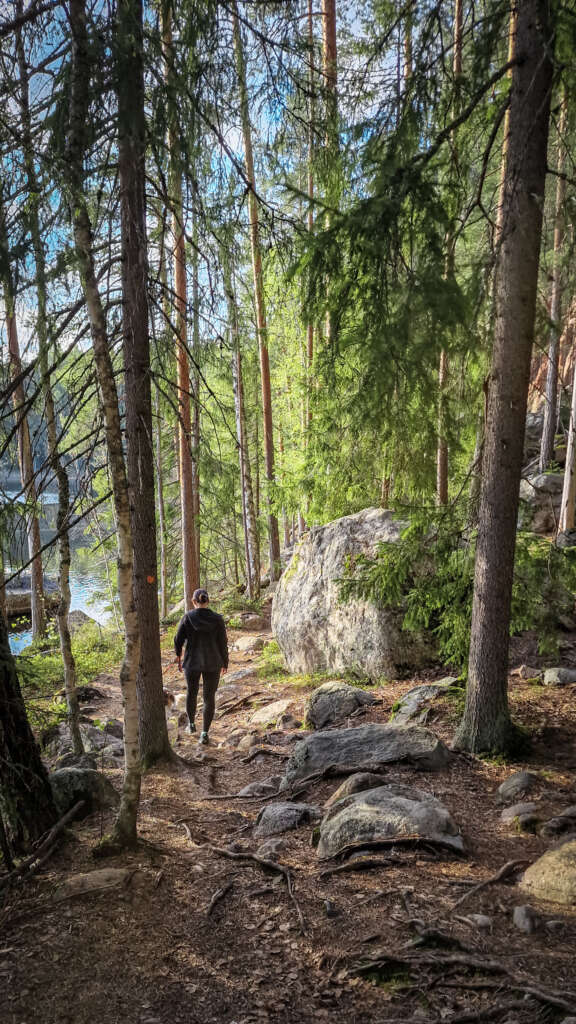 No ale nie o jedzeniu jest ten blog… Szlak prowadzi po okręgu , jednak nie można go wyznaczyć na mapie, bo dwukrotnie przecinamy jezioro. Po zejściu do jeziora skręciliśmy w prawo i po ok 800m doszliśmy do przeprawy tratwą. Troszeczkę przypomina to ścieżkę w Narwiańskim Parku Narodowym, gdzie przez Narew przeprawiamy się po dryfujących kładkach. Tutaj jednak odległość między brzegami robiła wrażenie. Niesamowita zabawa i troszeczkę adrenaliny gwarantowane. Przeciwległy brzeg jest mocno skalisty, przez co spektakularny szczególnie w miejscu, gdzie pionowa skała wpada praktycznie prosto do wody. Jest odrobina zabezpieczeń jednak właściwie i bez nich nie czułam niebezpieczeństwa. Większość szlaku, jak to zazwyczaj w Finlandii, biegnie przez las, z punktami widokowymi na jezioro. Po drodze miniecie też rozległą wiatę turystyczną z miejscem ogniskowym i toaletą. Jest tu także piękny widok na jezioro. Drugie takie miejsce znajduje się blisko mostu.